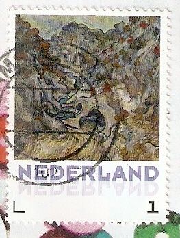Mi ankaŭ ŝatas arto. La poŝtmarko ĉi tie montras pentraĵon de Vincent van Gogh kun la nomo 'The ravine of the Peyroulets'.