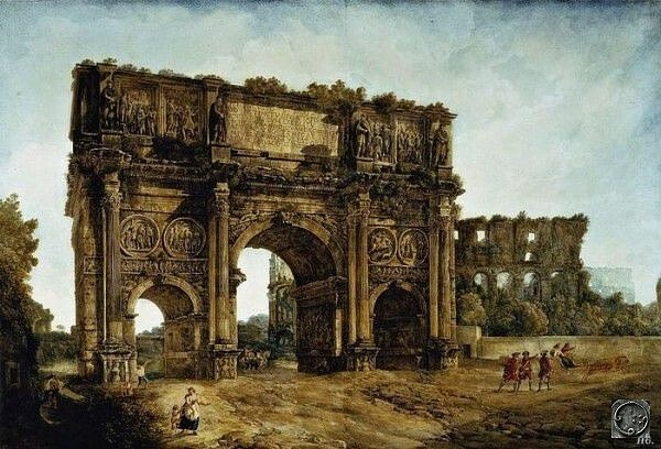 Ni rigardu pli detale la bildon. Kion ni vidas ĉi tie estas la arko mem kaj la sekvoj de la katastrofo. La detruita Koloseo en la fono. Juĝante laŭ la vegetaĵaro sur la konstruaĵoj, la pentraĵo estis pentrita 30-40 jarojn post la katastrofo. Dika tavolo de alportita argilo aŭ silto, plej verŝajne per ondoj. La akvo retiriĝis kaj homoj komencas reveni.