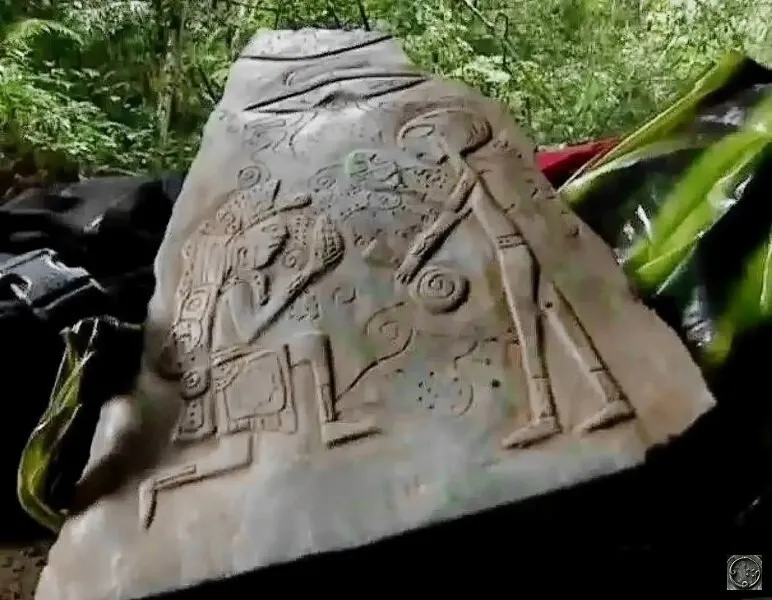 Sed unu el la slaboj montriĝis la plej interesa. Sur granda rektangula jada slabo estis skribite "ŝtono de la unua renkontiĝo", kune kun bildo de viro surgenuiĝanta kaj la sama estaĵo.