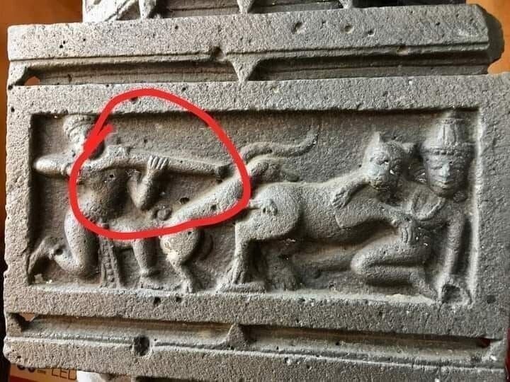 En budhana templo datiĝanta de la 16-a jarcento, plakedo prezentas frapan scenon: viro ĝoje tenanta ion, kio ŝajnas esti moderna pafilo.