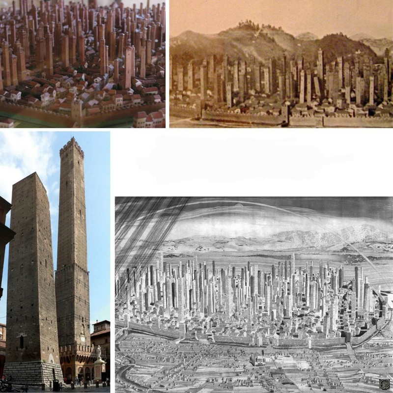 Ili estis konstruitaj, supozeble, antaŭ preskaŭ mil jaroj (inter la 12-a kaj 13-a jarcentoj) dum la Mezepoko. Oni ne scias, kia estis ilia celo kaj kiel precize ili estis konstruitaj. Hodiaŭ, nur du turoj restas, sed laŭ pli malnovaj bildoj kaj raportoj (el kiuj oni faris modelajn rekonstruojn), la tuta urbo konsistis el ĉi tiuj kaj pli altaj nubskrapuloj.
