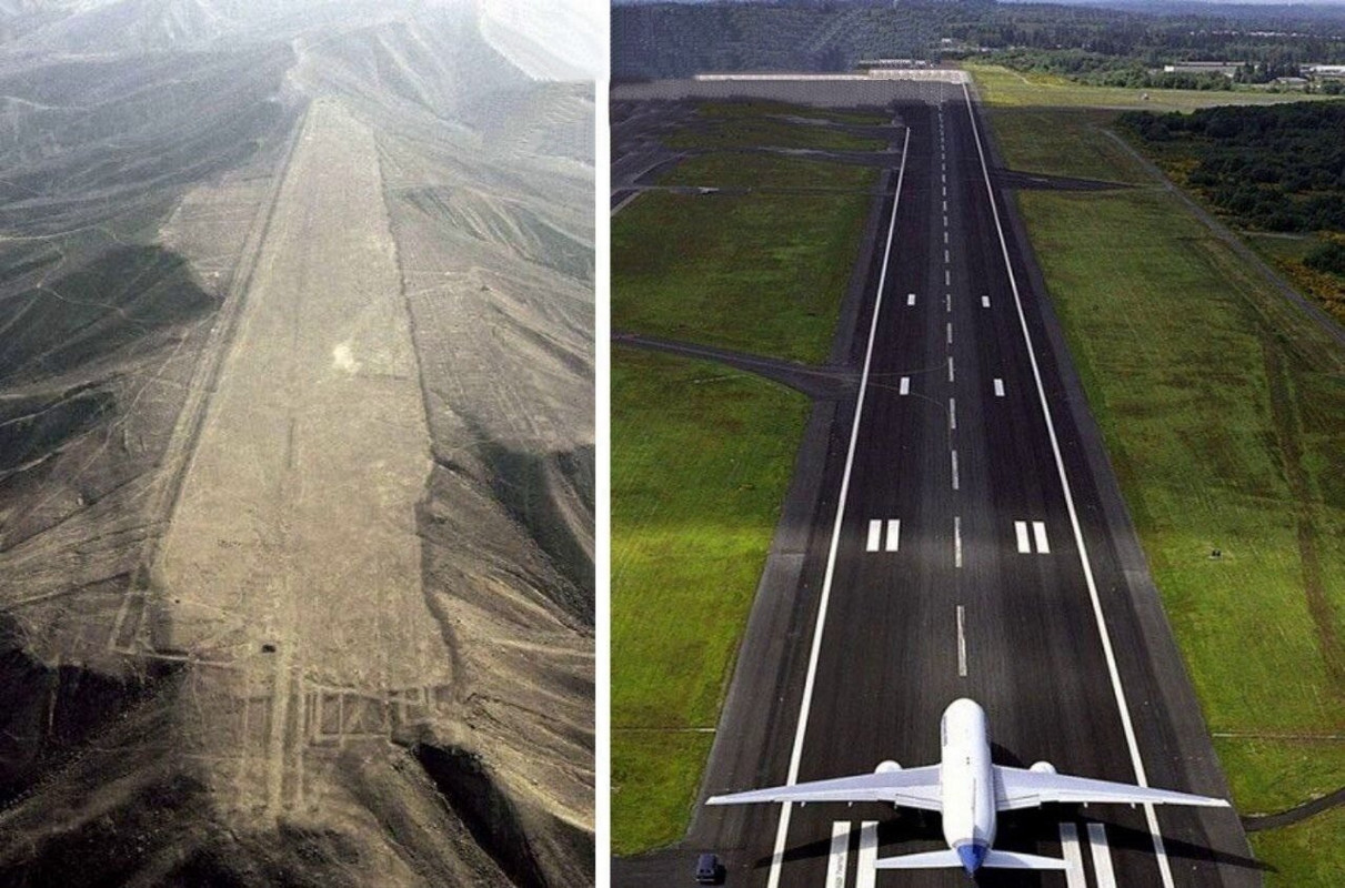 Dekstre estas 20-jarcenta startleno kreita per moderna teknologio kaj ekipaĵo. Notu la similecojn: plata, glata surfaco, ideala por ke aviadiloj deteriĝu kaj surteriĝu.