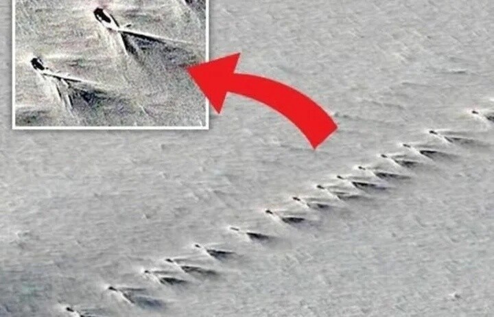 Esploristoj malkovris kelkajn misterajn objektojn, kiuj similas unu al la alia. Fakuloj kalkulis la grandecon de ĉiu el ili. La rezulto estas impona: 110 metrojn longa kaj 10 metrojn larĝa. Iliaj koordinatoj estas jenaj: 75° 0’46.98” S 0° 4’52.71” E.