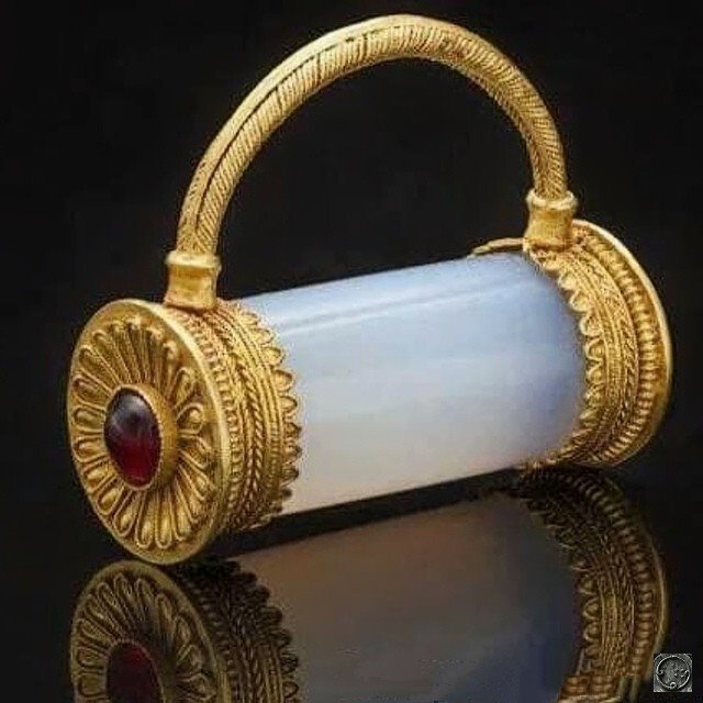 Materialo - oro kaj ŝtono. Grandeco - cilindra longo kun kadro: 4,1 cm; cilindra diametro: 1,5 cm; arkoalto: 1,8 cm. Kaj jen tio. Tio estas, dum multaj jaroj neniu estis surprizita de kiom zorge ĉi tiu cilindro estis prilaborita kaj ne pensis pri ĝia celo.