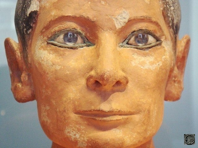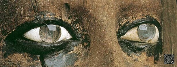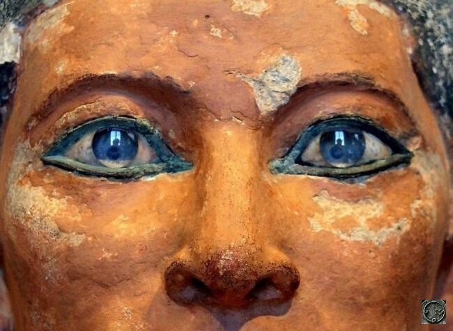 La okuloj de la ligna statuo de Faraono Horuso, kiel la okuloj de vivanta homo, aspektas bluaj aŭ grizaj depende de la angulo de lumigado kaj eĉ imitas la kapilaran strukturon de la retino! Esploro de Profesoro Jay Enoch de la Universitato de Berkeley montris la mirindan proksimecon de ĉi tiuj vitraj imitaĵoj al la formo kaj optikaj ecoj de vera okulo.